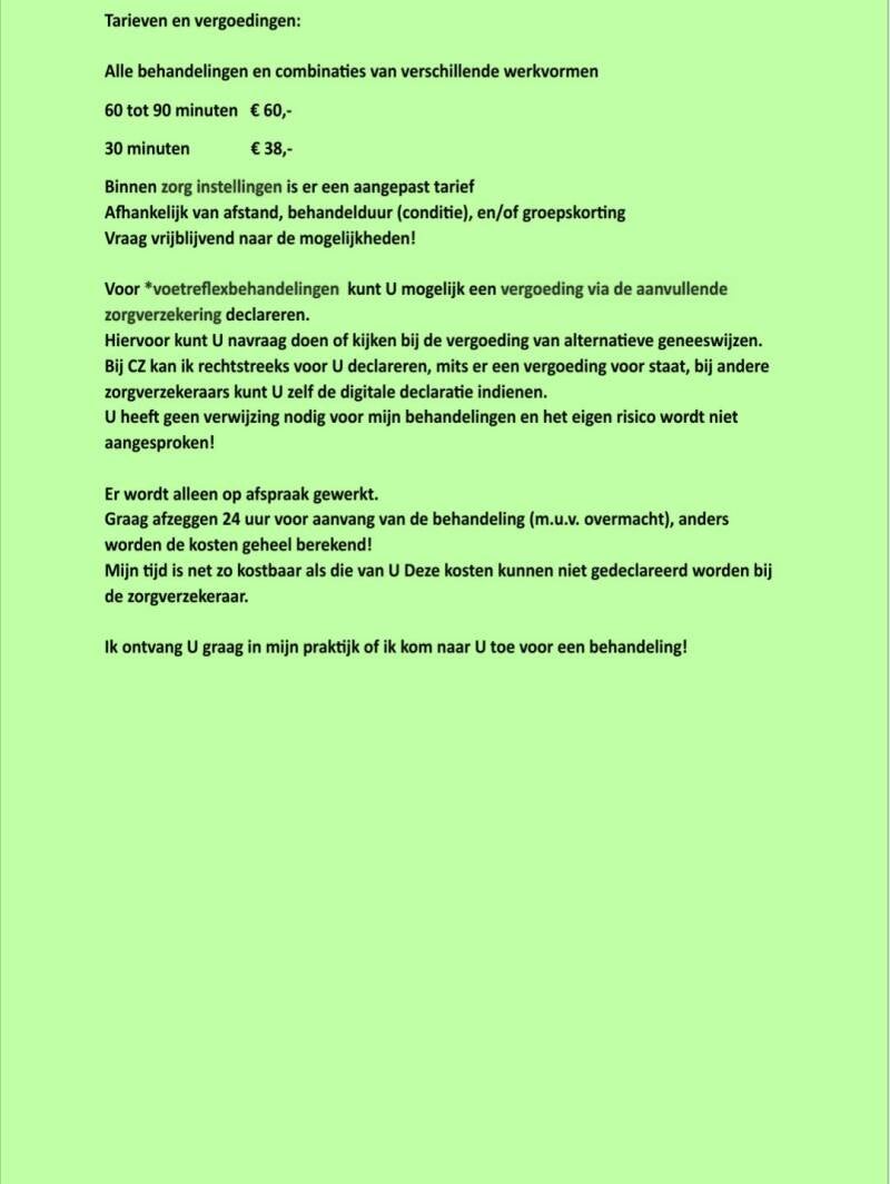 Voor de intake en extra tijd die nodig is voor de formulieren worden geen kosten berekend!